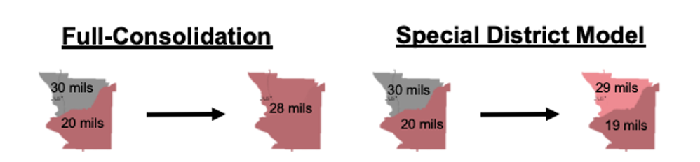 The service-district-approach works differently in a county-county consolidation than a city-county consolidation. Unlike a city, which before consolidation occurs, exists within the county, county-county consolidations bring together two geographically district territories. If counties consolidate using the special-district-approach, the general service district encompasses the entire area of the new county. This general service district takes on any new debt brought on by the county for county-wide expenditures, provide some minimum level of service, and levy a base tax rate for the administration of the consolidated county. Then, the areas within the territorial footprint of each dissolved county would be put into a special service district that retains the debt from the dissolved county, charges its own rate of taxes, and provides its own level of county services.