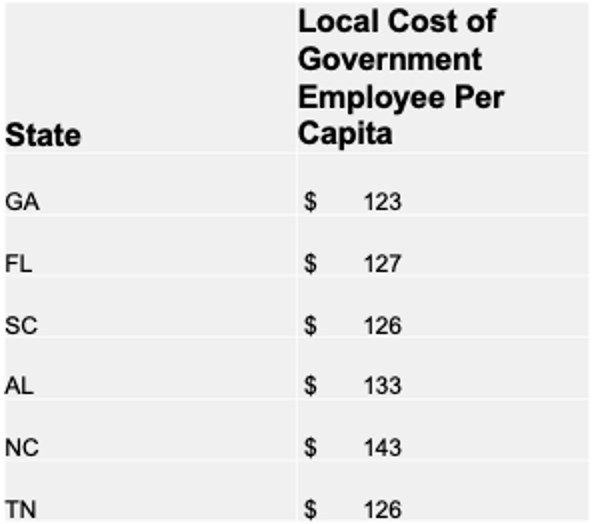 However, at the time of the Townsend study, Georgia had one of the most expensive per capita payrolls in the country, having nearly 600 state and local government employees per 10,000 people.[53] Times have changed though. Georgia is now operated more efficiently, having only 216 state and local government employees per 10,000 residents.[54] In fact, when looking at the total general expenses for running local governments in Georgia, Georgia spends less than any of its neighboring states, spending $123.46 per resident in 2020.[55]