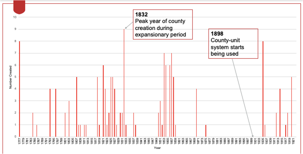 The “peel-off” movement accelerated when Georgia began implementing the county-unit system in 1898.[15] The county-unit system gave small counties a proportionately larger voice in state-level elections by assigning every county two votes, regardless of size.[16] The maximum number of votes even the largest counties could have was six.[17] Therefore, despite rural counties accounting for 32% of the state population, they controlled 59% of the vote.[18] Former Georgia Governor Eugene Talmadge said, “I can carry any county…that ain’t got street cars” showing the strong influence the county-unit system had on state politics.[19] Twenty-three counties were added between the time the county-unit system was established and abolished.[20] Many counties followed this movement, the last being in Peach County in 1924.[21] In 1945, the Georgia Constitution capped the number of counties at 159.[22]