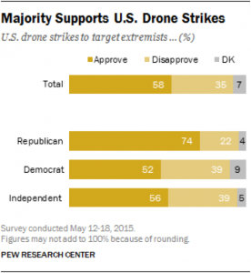 The people of the United States continue to approve drone strikes. 58 percent of the public is in support of the use of drones, while only 35 percent disapproves. The number increases to 74 percent approval throughout the Republican Party. The reason for this varies, but it may be caused because of a lack of media representation. For example, a strike in North Waziristan killed 10 people and another strike in South Waziristan killed four people, but the only news network that showed footage of these events was an English language Iranian governmental news channel. Furthermore, the United States conducts airstrikes in Yemen several times a month, but the U.S. Central Command announces these attacks weeks after they happen. Popular networks have the information on drone strikes but rarely care to report on it. The lack of mainstream coverage of frequent U.S. military drone strikes has left the general public ignorant about this serious issue.