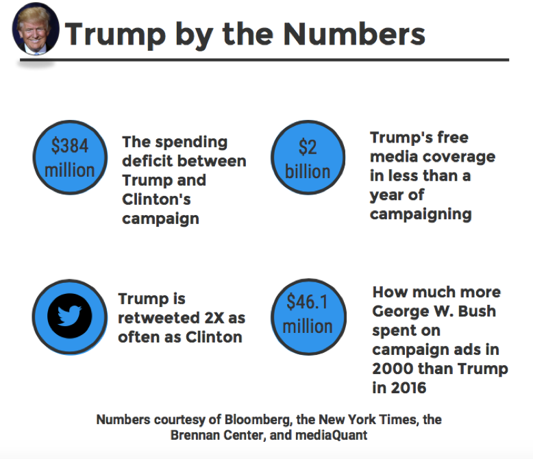 Trump’s 2016 campaign has been defined by a cash deficit compared to Clinton, yet he has remained competitive through months of campaigning, staying within striking distance and even leading at times. This is because Trump has followed a strategy that emphasizes media coverage and social media exposure over traditional TV advertisement. In doing so, Trump has created a potential blueprint for future cash-strapped campaigns to compete with better-organized and better-funded infrastructures.