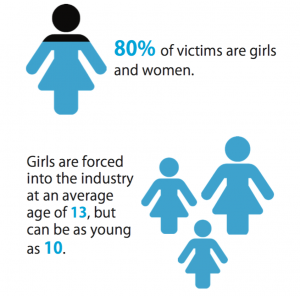 The victims are disproportionately women and young girls: in Georgia, girls are forced into the industry at an average age of 13, but can be as young as 10. The girls are often physically abused by their traffickers or threatened against fleeing, but many have no sense of life outside the sex trade anyway. Some girls are raped thousands of times before they escape, if they escape at all.