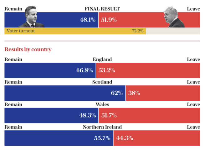 Looking at the results from the EU referendum, many urban epicenters, such as London and Manchester, voted to remain in the EU. However, much of the surrounding rural areas across the UK voted to leave. At the nation level, Scotland and Northern Ireland voted strongly to keep their place in the European single market. Conversely, England and Wales voted marginally to leave the EU. Lastly, Gibraltar, a contested UK overseas territory, voted unwaveringly to remain. These spatially-divided results set the stage for the stirring of independence movements in Scotland and Northern Ireland.