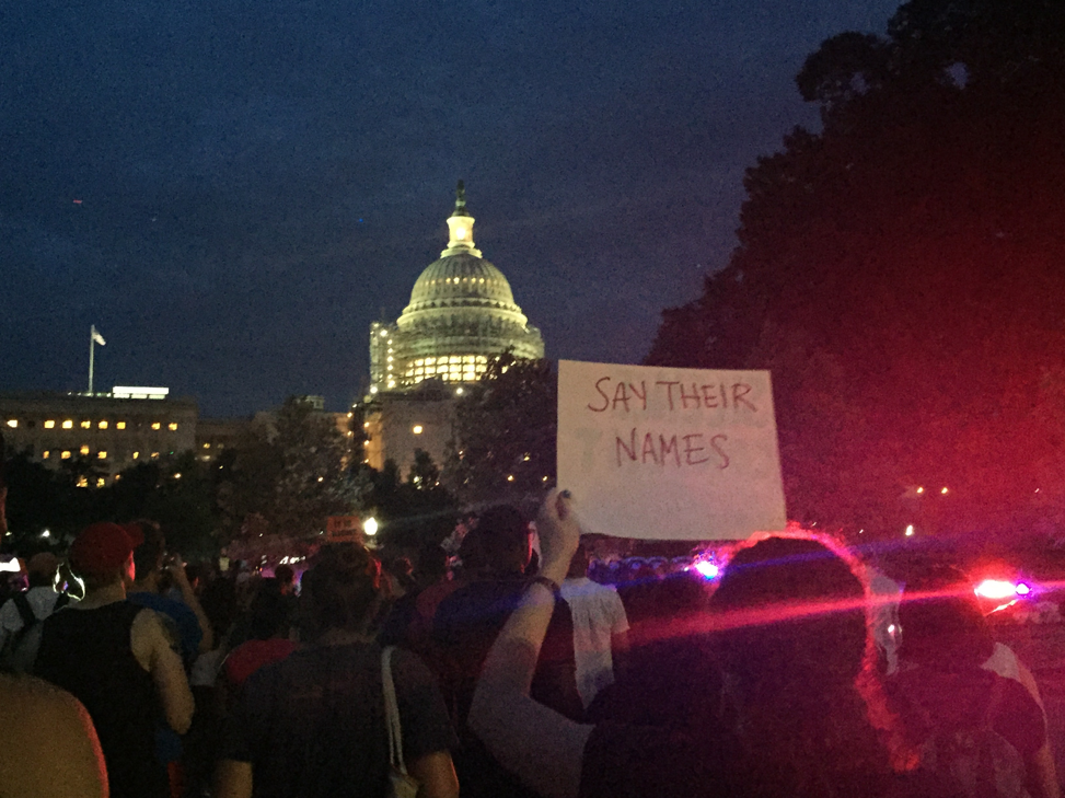 Forty members of Congress came out to talk to protestors in D.C. that Thursday night, including Georgia Congressman John Lewis — a hero of the civil rights movement and the congressional moral compass. Again, the organizer tried to quiet the crowd, asking them for respect as Lewis addressed the protesters.